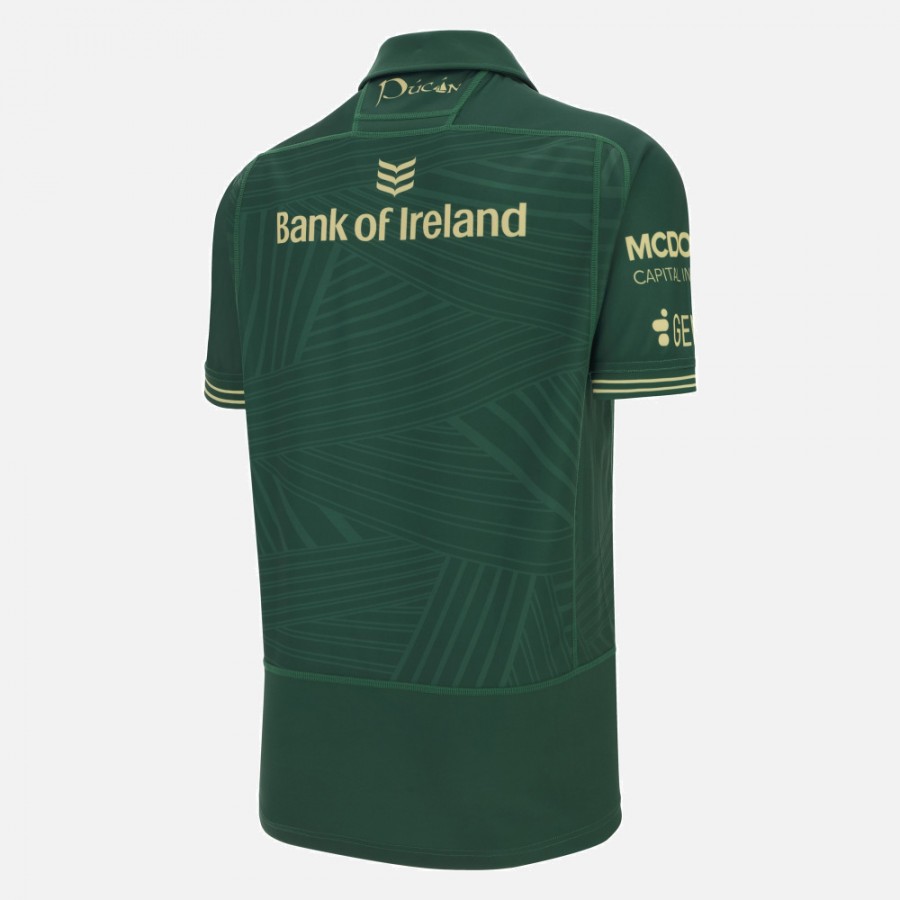 A jersey with a strong character that blends identity and tradition. The deep green recalls the Irish roots of the team, while the tone-on-tone graphic across the body celebrates Connacht’s deep connection with its territory. The relaxed fit and stretch polo collar provide comfort and structure, with silicone logos and the club’s historic winged eagle emblem proudly displayed on the chest.